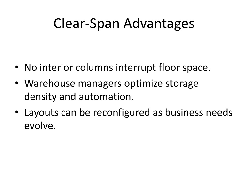 Clear-Span Advantages • No interior columns interrupt floor space. • Warehouse managers optimize storage density and automation. • Layouts can be reconfigured as business needs evolve.
