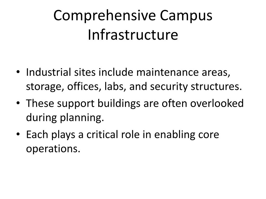 Comprehensive Campus Infrastructure • Industrial sites include maintenance areas, storage, offices, labs, and security structures. • These support buildings are often overlooked during planning. • Each plays a critical role in enabling core operations.