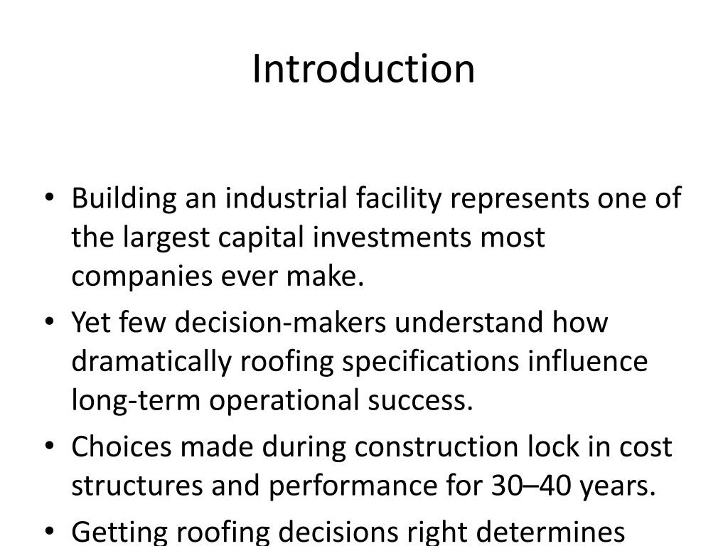 Introduction • Building an industrial facility represents one of the largest capital investments most companies ever make. • Yet few decision-makers understand how dramatically roofing specifications influence long-term operational success. • Choices made during construction lock in cost structures and performance for 30–40 years. • Getting roofing decisions right determines whether a facility becomes an asset or a financial burden.