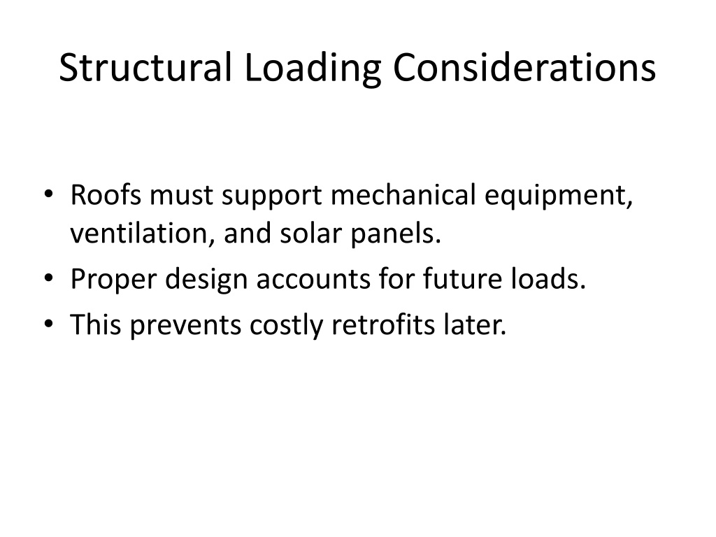 Structural Loading Considerations • Roofs must support mechanical equipment, ventilation, and solar panels. • Proper design accounts for future loads. • This prevents costly retrofits later.
