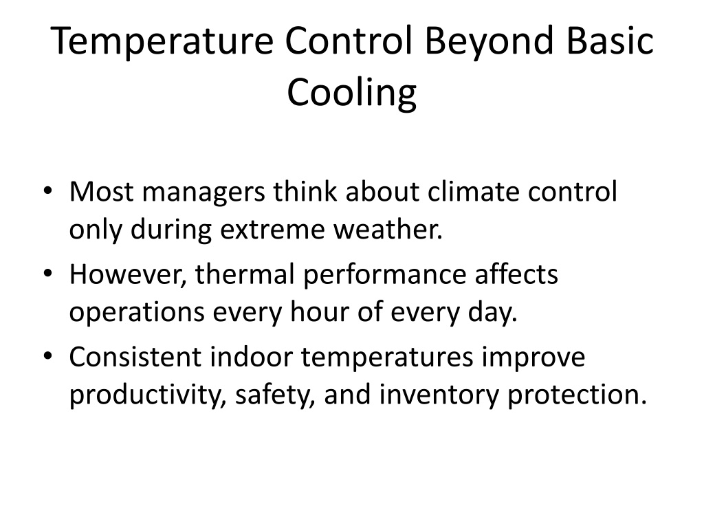 Temperature Control Beyond Basic Cooling • Most managers think about climate control only during extreme weather. • However, thermal performance affects operations every hour of every day. • Consistent indoor temperatures improve productivity, safety, and inventory protection.