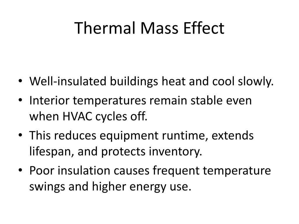 Thermal Mass Effect • Well-insulated buildings heat and cool slowly. • Interior temperatures remain stable even when HVAC cycles off. • This reduces equipment runtime, extends lifespan, and protects inventory. • Poor insulation causes frequent temperature swings and higher energy use.