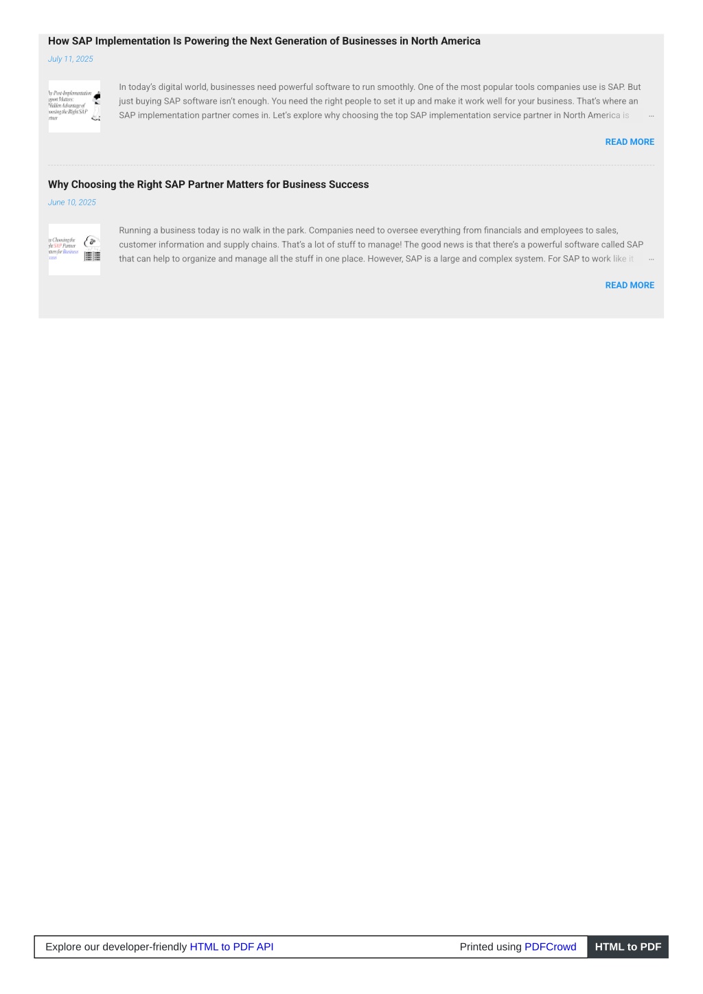 How SAP Implementation Is Powering the Next Generation of Businesses in North America July 11, 2025 In today’s digital world, businesses need powerful software to run smoothly. One of the most popular tools companies use is SAP. But just buying SAP software isn’t enough. You need the right people to set it up and make it work well for your business. That’s where an SAP implementation partner comes in. Let’s explore why choosing the top SAP implementation service partner in North America is … READ MORE Why Choosing the Right SAP Partner Matters for Business Success June 10, 2025 Running a business today is no walk in the park. Companies need to oversee everything from ?nancials and employees to sales, customer information and supply chains. That’s a lot of stuff to manage! The good news is that there’s a powerful software called SAP that can help to organize and manage all the stuff in one place. However, SAP is a large and complex system. For SAP to work like it … READ MORE Explore our developer-friendly HTML to PDF API Printed using PDFCrowd HTML to PDF