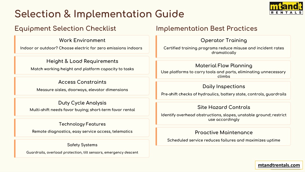 Selection & Implementation Guide Equipment Selection Checklist Implementation Best Practices Work Environment Operator Training Indoor or outdoor? Choose electric for zero emissions indoors Certified training programs reduce misuse and incident rates dramatically Height & Load Requirements Material Flow Planning Match working height and platform capacity to tasks Use platforms to carry tools and parts, eliminating unnecessary climbs Access Constraints Daily Inspections Measure aisles, doorways, elevator dimensions Pre-shift checks of hydraulics, battery state, controls, guardrails Duty Cycle Analysis Site Hazard Controls Multi-shift needs favor buying; short-term favor rental Identify overhead obstructions, slopes, unstable ground; restrict use accordingly Technology Features Remote diagnostics, easy service access, telematics Proactive Maintenance Scheduled service reduces failures and maximizes uptime Safety Systems Guardrails, overload protection, tilt sensors, emergency descent mtandtrentals.com