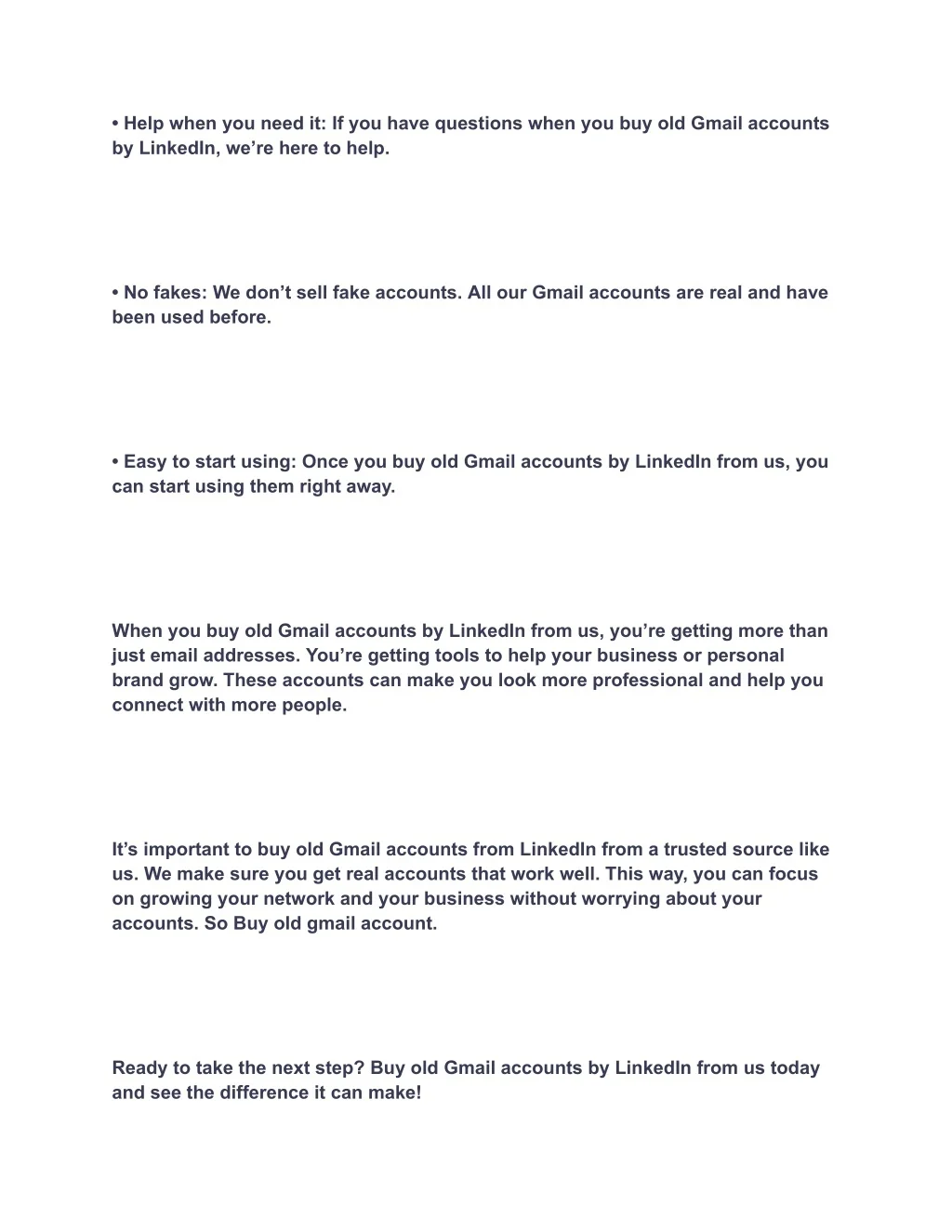 Here’s a section of SEO-friendly content focused on buying old Gmail accounts by LinkedIn, with bullet points and simple language: Our Buy Old Gmail Accounts by LinkedIn Looking to buy old Gmail accounts on LinkedIn? You’re in the right place! We offer a great service to help you get the accounts you need. Here’s why our service is the best choice: • Easy to use: We make it simple to buy old Gmail accounts buy LinkedIn. We’ll take care of the rest after you tell us what you need.