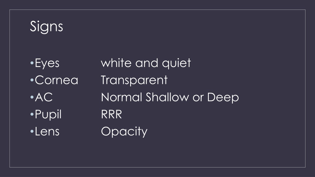 Signs • Eyes white and quiet • Cornea Transparent • AC Normal Shallow or Deep • Pupil RRR • Lens Opacity
