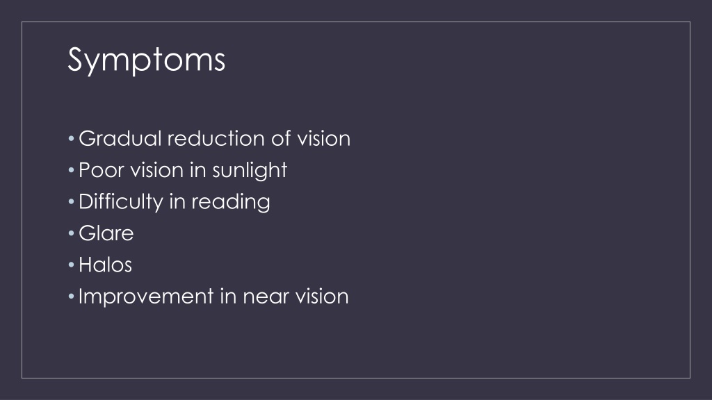 Symptoms • Gradual reduction of vision • Poor vision in sunlight • Difficulty in reading • Glare • Halos • Improvement in near vision