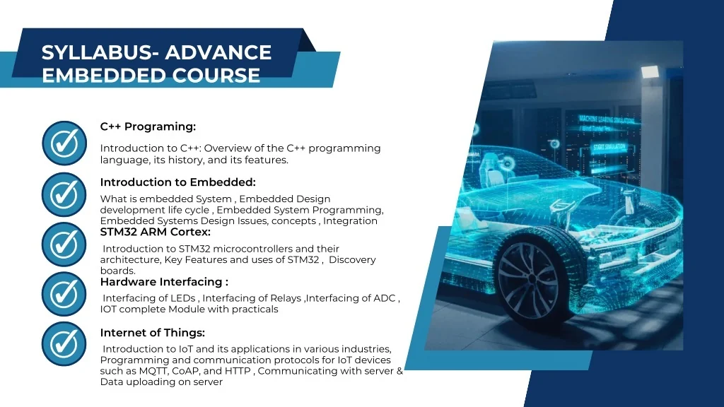 SYLLABUS- ADVANCE EMBEDDED COURSE C++ Programing: Introduction to C++: Overview of the C++ programming language, its history, and its features. Introduction to Embedded: What is embedded System , Embedded Design development life cycle , Embedded System Programming, Embedded Systems Design Issues, concepts , Integration STM32 ARM Cortex: Introduction to STM32 microcontrollers and their architecture, Key Features and uses of STM32 , Discovery boards. Hardware Interfacing : Interfacing of LEDs , Interfacing of Relays ,Interfacing of ADC , IOT complete Module with practicals Internet of Things: Introduction to IoT and its applications in various industries, Programming and communication protocols for IoT devices such as MQTT, CoAP, and HTTP , Communicating with server & Data uploading on server