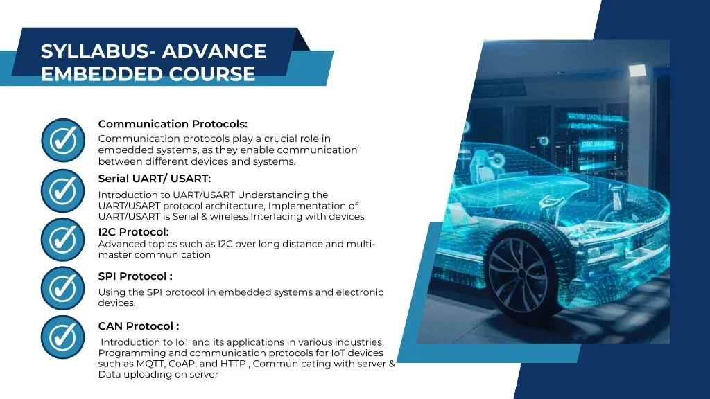 SYLLABUS- ADVANCE EMBEDDED COURSE Communication Protocols: Communication protocols play a crucial role in embedded systems, as they enable communication between different devices and systems. Serial UART/ USART: Introduction to UART/USART Understanding the UART/USART protocol architecture, Implementation of UART/USART is Serial & wireless Interfacing with devices I2C Protocol: Advanced topics such as I2C over long distance and multi- master communication SPI Protocol : Using the SPI protocol in embedded systems and electronic devices. CAN Protocol : Introduction to IoT and its applications in various industries, Programming and communication protocols for IoT devices such as MQTT, CoAP, and HTTP , Communicating with server & Data uploading on server