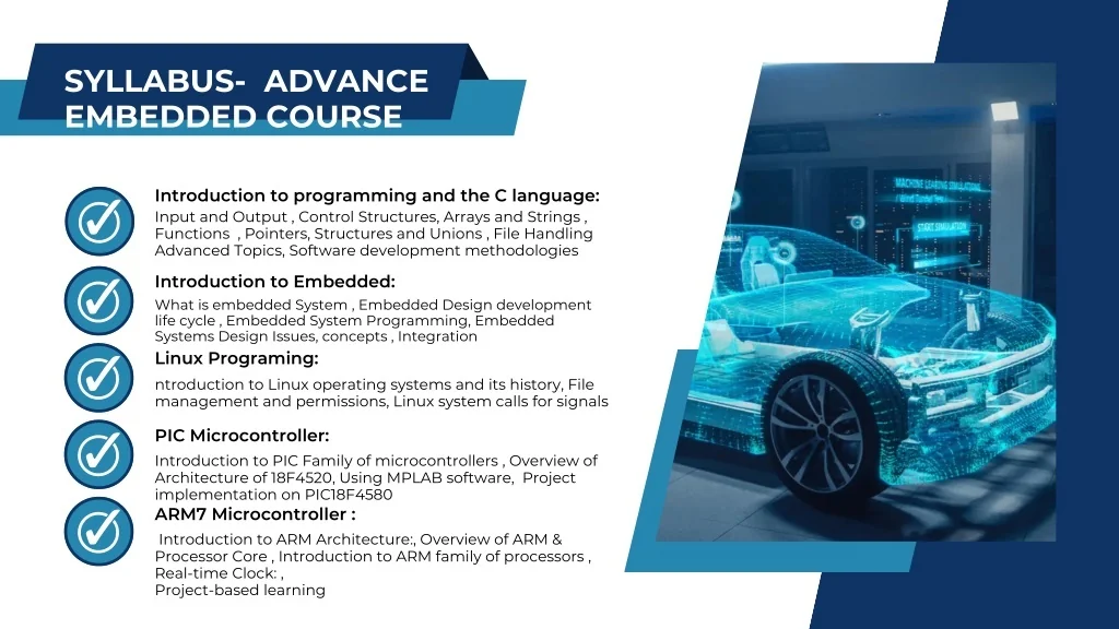 SYLLABUS- ADVANCE EMBEDDED COURSE Introduction to programming and the C language: Input and Output , Control Structures, Arrays and Strings , Functions , Pointers, Structures and Unions , File Handling Advanced Topics, Software development methodologies Introduction to Embedded: What is embedded System , Embedded Design development life cycle , Embedded System Programming, Embedded Systems Design Issues, concepts , Integration Linux Programing: ntroduction to Linux operating systems and its history, File management and permissions, Linux system calls for signals PIC Microcontroller: Introduction to PIC Family of microcontrollers , Overview of Architecture of 18F4520, Using MPLAB software, Project implementation on PIC18F4580 ARM7 Microcontroller : Introduction to ARM Architecture:, Overview of ARM & Processor Core , Introduction to ARM family of processors , Real-time Clock: , Project-based learning