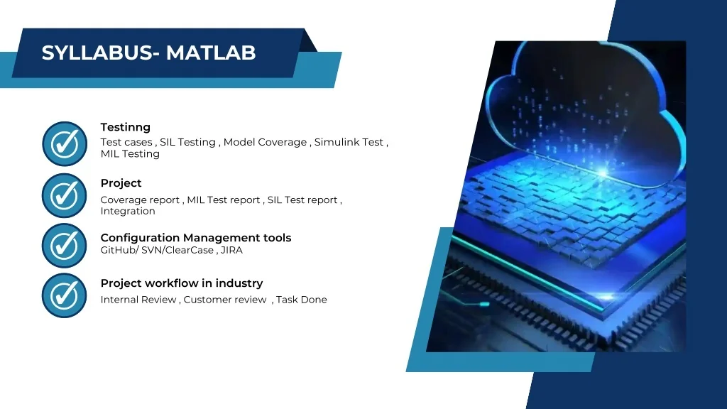 SYLLABUS- MATLAB Testinng Test cases , SIL Testing , Model Coverage , Simulink Test , MIL Testing Project Coverage report , MIL Test report , SIL Test report , Integration Configuration Management tools GitHub/ SVN/ClearCase , JIRA Project workflow in industry Internal Review , Customer review , Task Done
