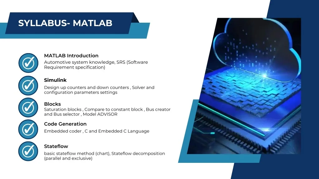 SYLLABUS- MATLAB MATLAB Introduction Automotive system knowledge, SRS (Software Requirement specification) Simulink Design up counters and down counters , Solver and configuration parameters settings Blocks Saturation blocks , Compare to constant block , Bus creator and Bus selector , Model ADVISOR Code Generation Embedded coder , C and Embedded C Language Stateflow basic stateflow method (chart), Stateflow decomposition (parallel and exclusive)