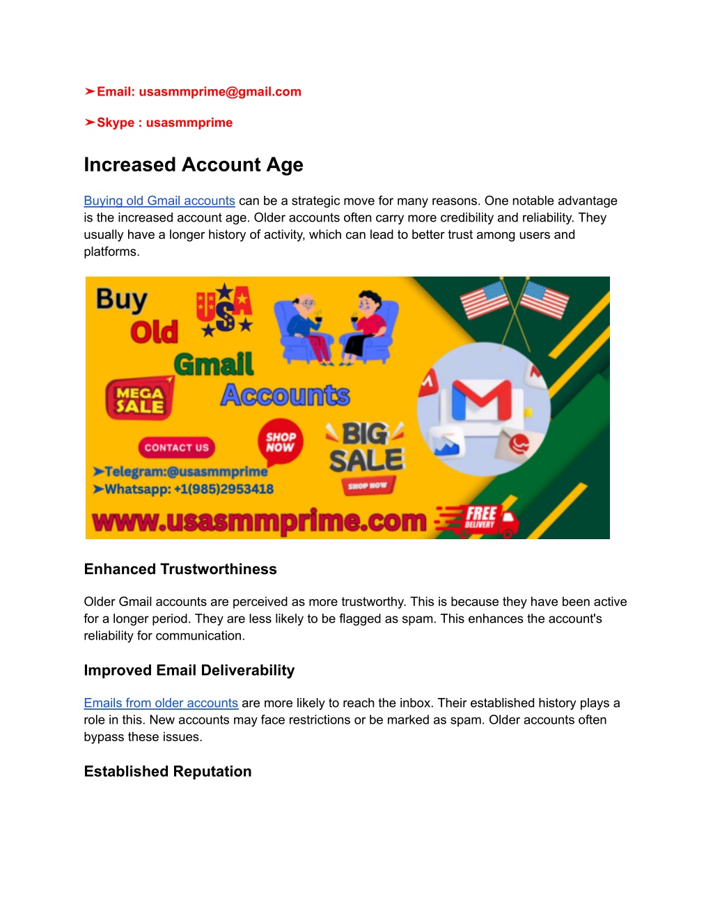 Trust And Credibility Trust is a cornerstone in the digital world. Old Gmail accounts can boost your credibility. They establish a sense of reliability. People trust older accounts more than new ones. This trust can lead to better engagement and interactions. How Old Gmail Accounts Build Trust Older accounts have a history. This history makes them appear more trustworthy. Users feel safer communicating with established accounts. The longer an account exists, the more credibility it gains. This helps in building a positive image. Strengthening Brand Image With Established Accounts Brands benefit from using old Gmail accounts. They give the impression of stability. An account that has been around for years seems reliable. This enhances the brand image and attracts more customers. 24 Hours Reply/Contact ➤Telegram:@usasmmprime ➤Whatsapp: +1(985)2953418 ➤Email: usasmmprime@gmail.com ➤Skype : usasmmprime Improved Communication And Engagement Trust leads to better communication. People are more likely to engage with trusted accounts. Old Gmail accounts foster this trust. Engagement rates increase when users feel secure. This can lead to more meaningful interactions. Reducing Spam Filters With Trusted Accounts Spam filters are less likely to flag old accounts. These accounts have a proven track record. They are seen as less risky by email services. This reduces the chance of emails being marked as spam. Enhanced Email Deliverability Enhanced email deliverability is a crucial factor for anyone who relies on email marketing or communication. Imagine spending hours crafting a perfect email,