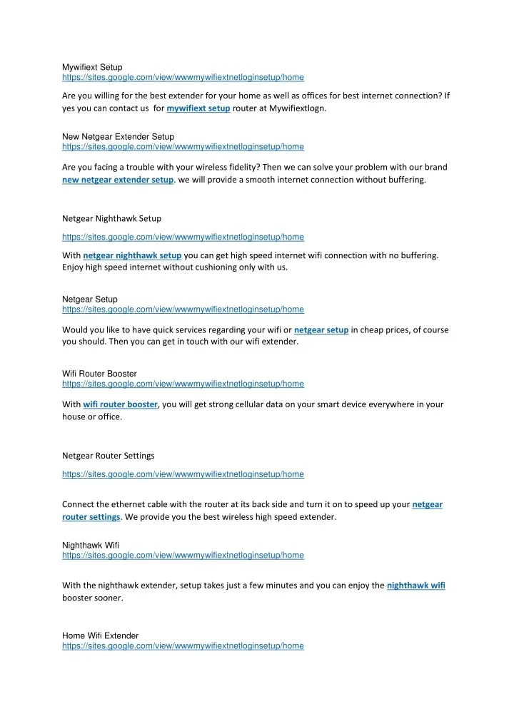 Mywifiext Setup https://sites.google.com/view/wwwmywifiextnetloginsetup/home Are you willing for the best extender for your home as well as offices for best internet connection? If yes you can contact us for mywifiext setup router at Mywifiextlogn. New Netgear Extender Setup https://sites.google.com/view/wwwmywifiextnetloginsetup/home Are you facing a trouble with your wireless fidelity? Then we can solve your problem with our brand new netgear extender setup. we will provide a smooth internet connection without buffering. Netgear Nighthawk Setup https://sites.google.com/view/wwwmywifiextnetloginsetup/home With netgear nighthawk setup you can get high speed internet wifi connection with no buffering. Enjoy high speed internet without cushioning only with us. Netgear Setup https://sites.google.com/view/wwwmywifiextnetloginsetup/home Would you like to have quick services regarding your wifi or netgear setup in cheap prices, of course you should. Then you can get in touch with our wifi extender. Wifi Router Booster https://sites.google.com/view/wwwmywifiextnetloginsetup/home With wifi router booster, you will get strong cellular data on your smart device everywhere in your house or office. Netgear Router Settings https://sites.google.com/view/wwwmywifiextnetloginsetup/home Connect the ethernet cable with the router at its back side and turn it on to speed up your netgear router settings. We provide you the best wireless high speed extender. Nighthawk Wifi https://sites.google.com/view/wwwmywifiextnetloginsetup/home With the nighthawk extender, setup takes just a few minutes and you can enjoy the nighthawk wifi booster sooner. Home Wifi Extender https://sites.google.com/view/wwwmywifiextnetloginsetup/home