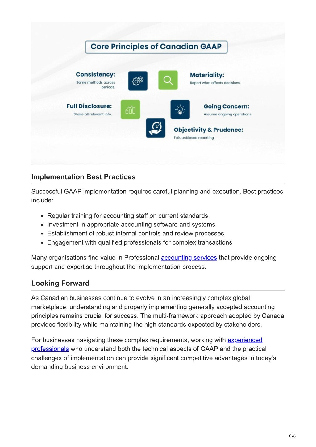 Implementation Best Practices Successful GAAP implementation requires careful planning and execution. Best practices include: Regular training for accounting staff on current standards Investment in appropriate accounting software and systems Establishment of robust internal controls and review processes Engagement with qualified professionals for complex transactions Many organisations find value in Professional accounting services that provide ongoing support and expertise throughout the implementation process. Looking Forward As Canadian businesses continue to evolve in an increasingly complex global marketplace, understanding and properly implementing generally accepted accounting principles remains crucial for success. The multi-framework approach adopted by Canada provides flexibility while maintaining the high standards expected by stakeholders. For businesses navigating these complex requirements, working with experienced professionals who understand both the technical aspects of GAAP and the practical challenges of implementation can provide significant competitive advantages in today’s demanding business environment. 6/6