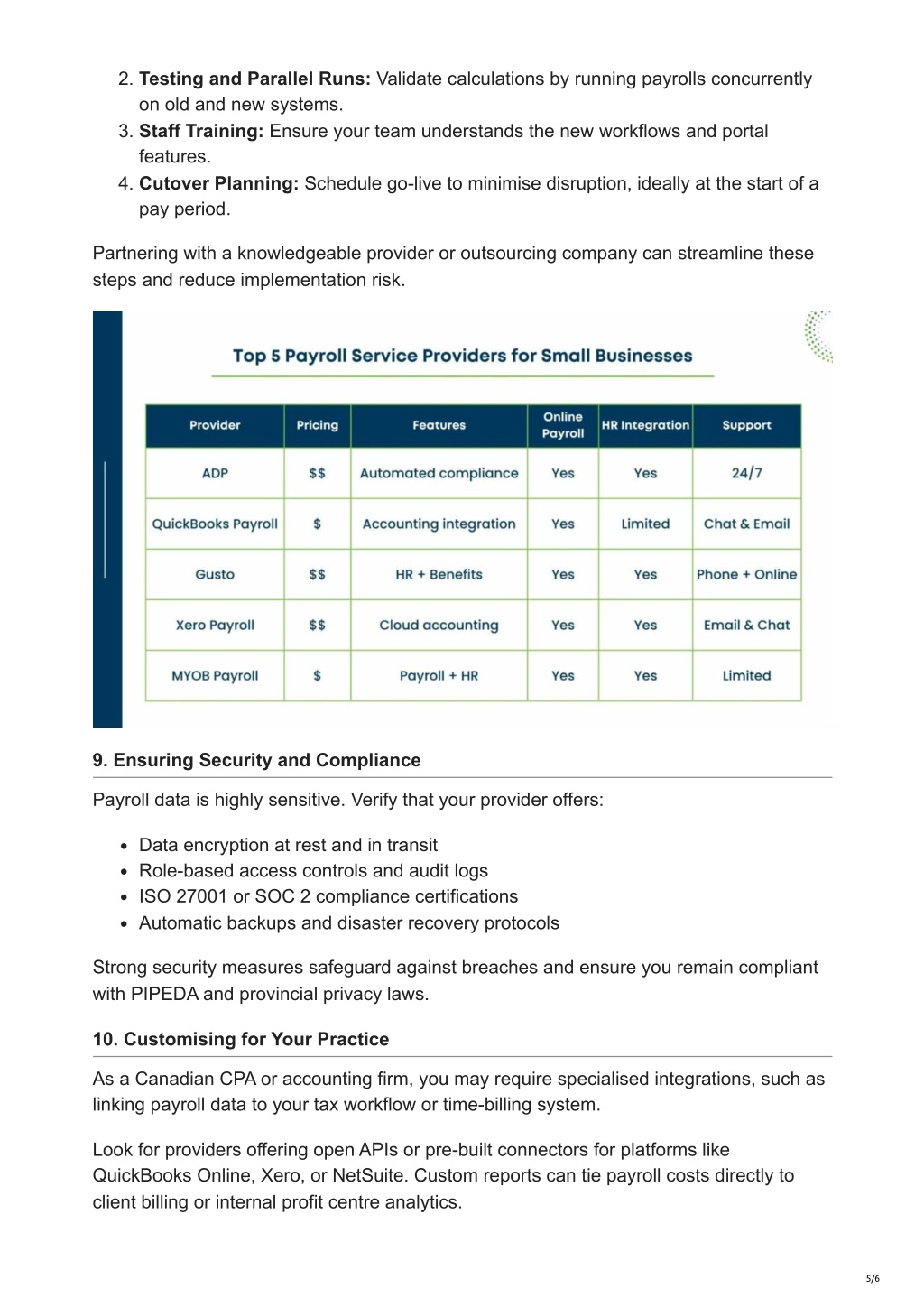 2. Testing and Parallel Runs: Validate calculations by running payrolls concurrently on old and new systems. 3. Staff Training: Ensure your team understands the new workflows and portal features. 4. Cutover Planning: Schedule go-live to minimise disruption, ideally at the start of a pay period. Partnering with a knowledgeable provider or outsourcing company can streamline these steps and reduce implementation risk. 9. Ensuring Security and Compliance Payroll data is highly sensitive. Verify that your provider offers: Data encryption at rest and in transit Role-based access controls and audit logs ISO 27001 or SOC 2 compliance certifications Automatic backups and disaster recovery protocols Strong security measures safeguard against breaches and ensure you remain compliant with PIPEDA and provincial privacy laws. 10. Customising for Your Practice As a Canadian CPA or accounting firm, you may require specialised integrations, such as linking payroll data to your tax workflow or time-billing system. Look for providers offering open APIs or pre-built connectors for platforms like QuickBooks Online, Xero, or NetSuite. Custom reports can tie payroll costs directly to client billing or internal profit centre analytics. 5/6