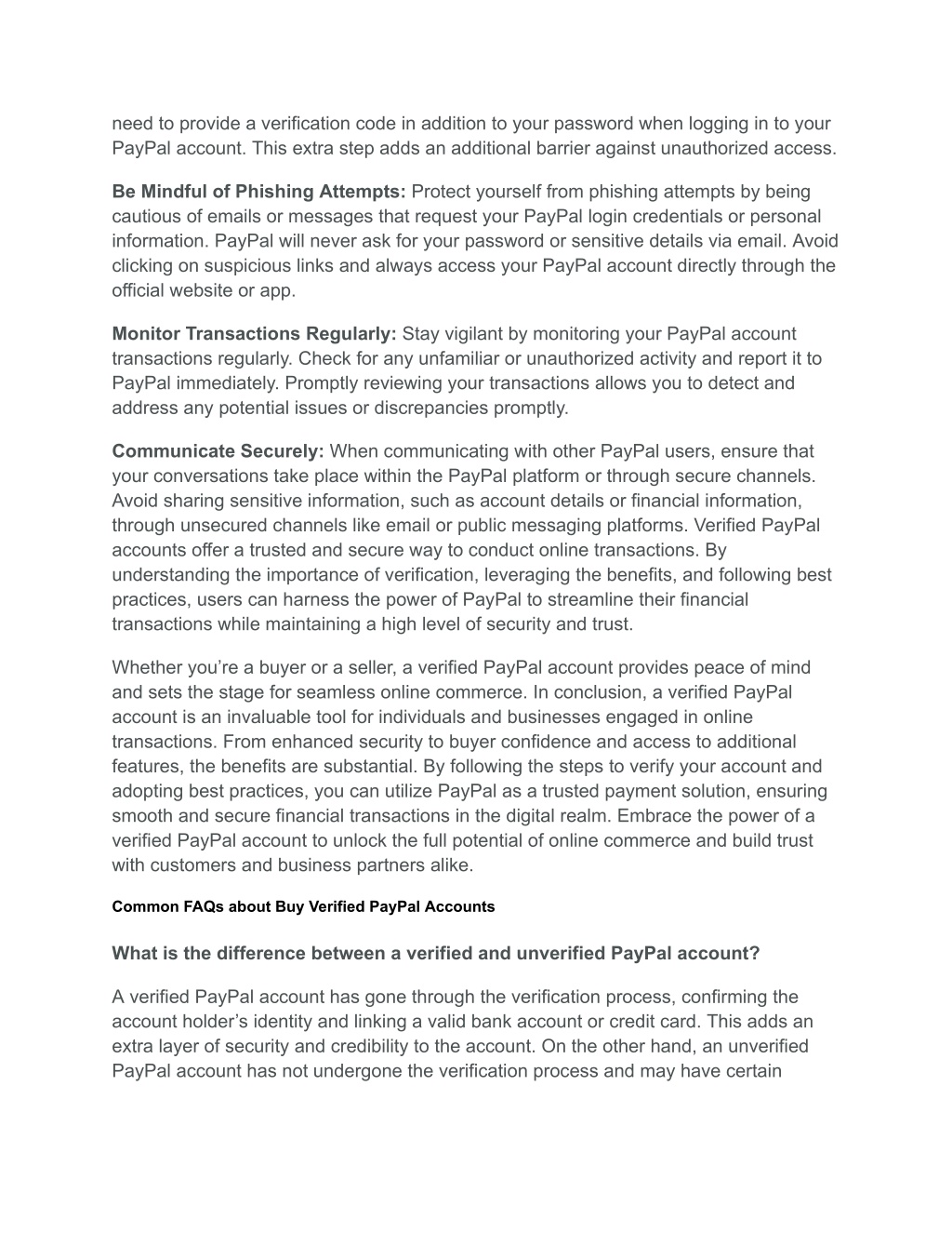 need to provide a verification code in addition to your password when logging in to your PayPal account. This extra step adds an additional barrier against unauthorized access. Be Mindful of Phishing Attempts: Protect yourself from phishing attempts by being cautious of emails or messages that request your PayPal login credentials or personal information. PayPal will never ask for your password or sensitive details via email. Avoid clicking on suspicious links and always access your PayPal account directly through the official website or app. Monitor Transactions Regularly: Stay vigilant by monitoring your PayPal account transactions regularly. Check for any unfamiliar or unauthorized activity and report it to PayPal immediately. Promptly reviewing your transactions allows you to detect and address any potential issues or discrepancies promptly. Communicate Securely: When communicating with other PayPal users, ensure that your conversations take place within the PayPal platform or through secure channels. Avoid sharing sensitive information, such as account details or financial information, through unsecured channels like email or public messaging platforms. Verified PayPal accounts offer a trusted and secure way to conduct online transactions. By understanding the importance of verification, leveraging the benefits, and following best practices, users can harness the power of PayPal to streamline their financial transactions while maintaining a high level of security and trust. Whether you’re a buyer or a seller, a verified PayPal account provides peace of mind and sets the stage for seamless online commerce. In conclusion, a verified PayPal account is an invaluable tool for individuals and businesses engaged in online transactions. From enhanced security to buyer confidence and access to additional features, the benefits are substantial. By following the steps to verify your account and adopting best practices, you can utilize PayPal as a trusted payment solution, ensuring smooth and secure financial transactions in the digital realm. Embrace the power of a verified PayPal account to unlock the full potential of online commerce and build trust with customers and business partners alike. Common FAQs about Buy Verified PayPal Accounts What is the difference between a verified and unverified PayPal account? A verified PayPal account has gone through the verification process, confirming the account holder’s identity and linking a valid bank account or credit card. This adds an extra layer of security and credibility to the account. On the other hand, an unverified PayPal account has not undergone the verification process and may have certain