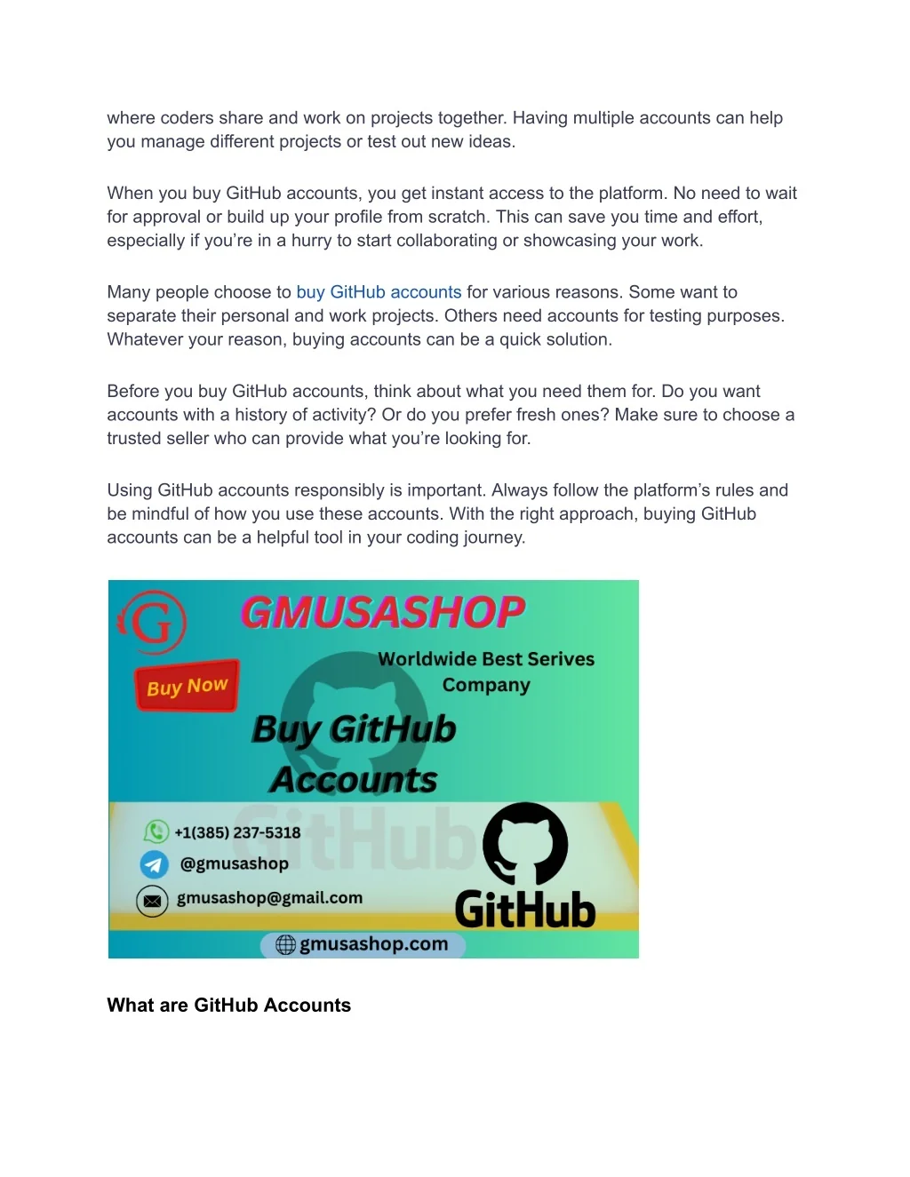 Contact Us / 24 Hours Reply https://gmusashop.com/product/buy-github-accounts/ Telegram: @gmusashop WhatsApp: +1 (385)237-5318 Email: gmusashop@gamil.com Buy GitHub Accounts Are you looking to boost your coding projects? Want to join a thriving community of developers? You might want to buy GitHub accounts. GitHub is a popular platform