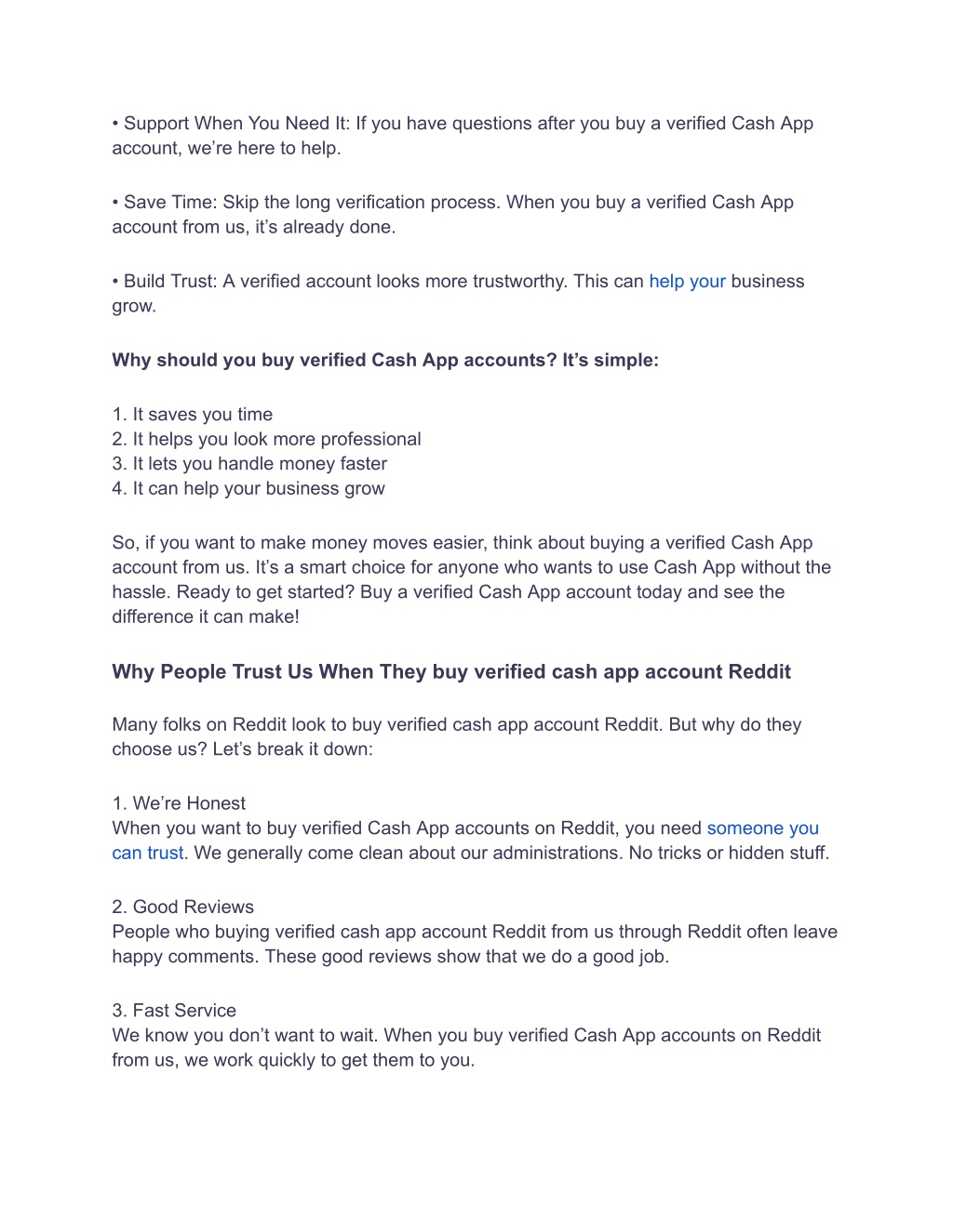 • Support When You Need It: If you have questions after you buy a verified Cash App account, we’re here to help. • Save Time: Skip the long verification process. When you buy a verified Cash App account from us, it’s already done. • Build Trust: A verified account looks more trustworthy. This can help your business grow. Why should you buy verified Cash App accounts? It’s simple: 1. It saves you time 2. It helps you look more professional 3. It lets you handle money faster 4. It can help your business grow So, if you want to make money moves easier, think about buying a verified Cash App account from us. It’s a smart choice for anyone who wants to use Cash App without the hassle. Ready to get started? Buy a verified Cash App account today and see the difference it can make! Why People Trust Us When They buy verified cash app account Reddit Many folks on Reddit look to buy verified cash app account Reddit. But why do they choose us? Let’s break it down: 1. We’re Honest When you want to buy verified Cash App accounts on Reddit, you need someone you can trust. We generally come clean about our administrations. No tricks or hidden stuff. 2. Good Reviews People who buying verified cash app account Reddit from us through Reddit often leave happy comments. These good reviews show that we do a good job. 3. Fast Service We know you don’t want to wait. When you buy verified Cash App accounts on Reddit from us, we work quickly to get them to you.