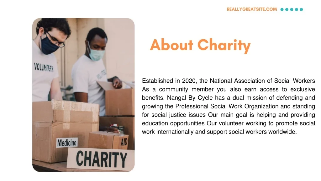 REALLYGREATSITE.COM About Charity Established in 2020, the National Association of Social Workers As a community member you also earn access to exclusive benefits. Nangal By Cycle has a dual mission of defending and growing the Professional Social Work Organization and standing for social justice issues Our main goal is helping and providing education opportunities Our volunteer working to promote social work internationally and support social workers worldwide.