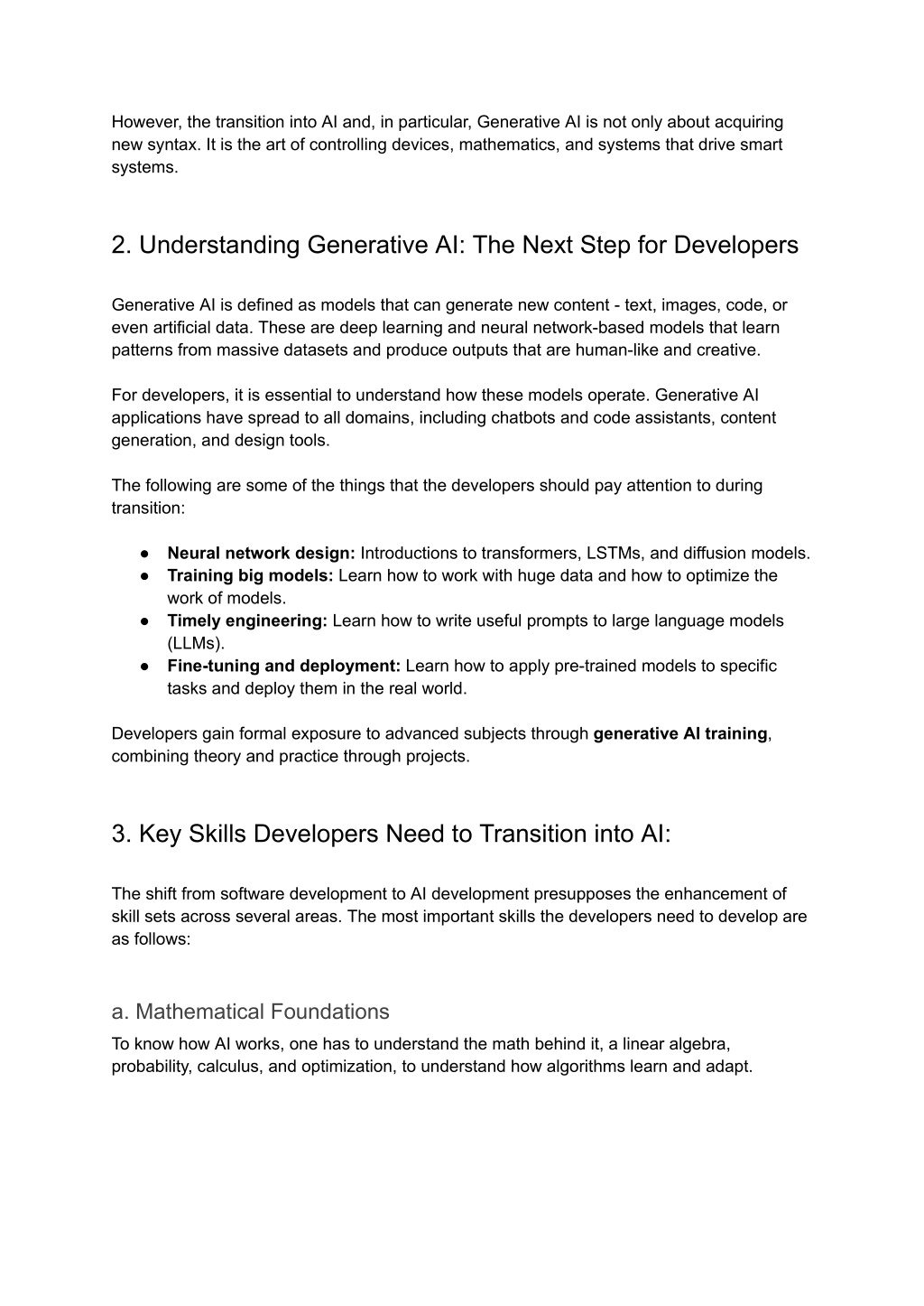 However, the transition into AI and, in particular, Generative AI is not only about acquiring new syntax. It is the art of controlling devices, mathematics, and systems that drive smart systems. 2. Understanding Generative AI: The Next Step for Developers Generative AI is defined as models that can generate new content - text, images, code, or even artificial data. These are deep learning and neural network-based models that learn patterns from massive datasets and produce outputs that are human-like and creative. For developers, it is essential to understand how these models operate. Generative AI applications have spread to all domains, including chatbots and code assistants, content generation, and design tools. The following are some of the things that the developers should pay attention to during transition: ● Neural network design: Introductions to transformers, LSTMs, and diffusion models. ● Training big models: Learn how to work with huge data and how to optimize the work of models. ● Timely engineering: Learn how to write useful prompts to large language models (LLMs). ● Fine-tuning and deployment: Learn how to apply pre-trained models to specific tasks and deploy them in the real world. Developers gain formal exposure to advanced subjects through generative AItraining, combining theory and practice through projects. 3. Key Skills Developers Need to Transition into AI: The shift from software development to AI development presupposes the enhancement of skill sets across several areas. The most important skills the developers need to develop are as follows: a. Mathematical Foundations To know how AI works, one has to understand the math behind it, a linear algebra, probability, calculus, and optimization, to understand how algorithms learn and adapt.