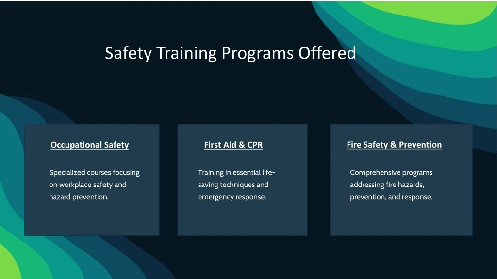 Safety Training Programs Offered Fire Safety & Prevention Comprehensive programs addressing fire hazards, prevention, and response. Occupational Safety First Aid & CPR Specialized courses focusing on workplace safety and hazard prevention. Training in essential life-saving techniques and emergency response.