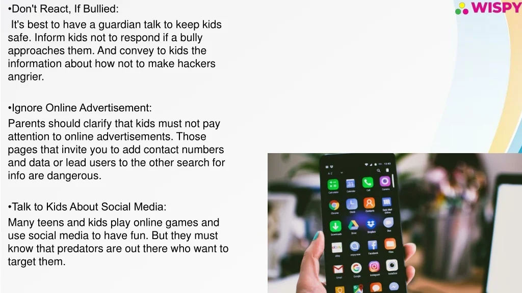 •Don't React, If Bullied: It's best to have a guardian talk to keep kids safe. Inform kids not to respond if a bully approaches them. And convey to kids the information about how not to make hackers angrier. •Ignore Online Advertisement: Parents should clarify that kids must not pay attention to online advertisements. Those pages that invite you to add contact numbers and data or lead users to the other search for info are dangerous. •Talk to Kids About Social Media: Many teens and kids play online games and use social media to have fun. But they must know that predators are out there who want to target them.