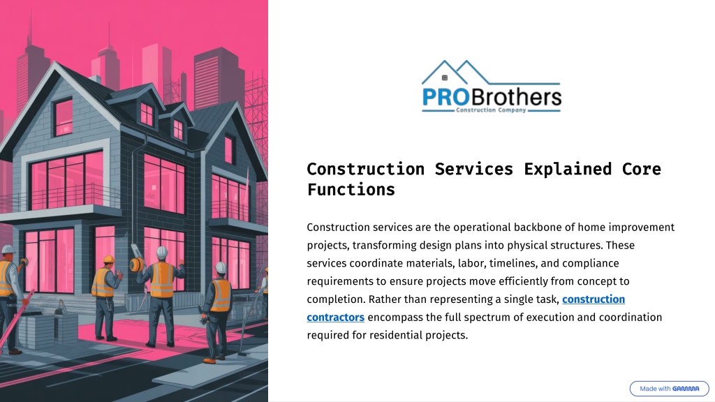 Who Relies on Construction Services Multiple stakeholders depend on construction coordination to maintain alignment throughout the project lifecycle. Each role brings unique expertise to the table. Homeowners Designers Planning and overseeing improvements to their properties, making key decisions about scope and budget Translating concepts into buildable plans and ensuring design accuracy throughout construction Tradespeople Inspectors Executing specialized tasks like electrical, plumbing, carpentry, and finishing work Reviewing work for compliance with building codes and safety standards at key milestones Learn more about construction services: Visit probrothers.com for detailed information on residential construction solutions.