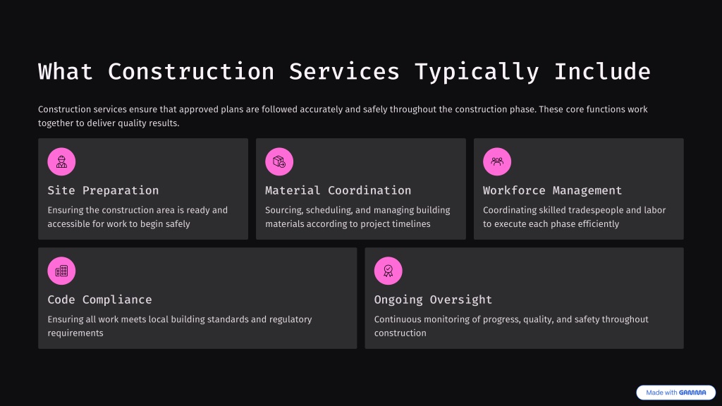 What Construction Services Typically Include Construction services ensure that approved plans are followed accurately and safely throughout the construction phase. These core functions work together to deliver quality results. Site Preparation Material Coordination Workforce Management Ensuring the construction area is ready and accessible for work to begin safely Sourcing, scheduling, and managing building materials according to project timelines Coordinating skilled tradespeople and labor to execute each phase efficiently Code Compliance Ongoing Oversight Ensuring all work meets local building standards and regulatory requirements Continuous monitoring of progress, quality, and safety throughout construction