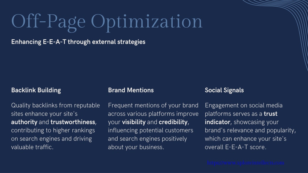 Backlink Building • Brand Mentions • Social Signals • Off-Page Optimization • Quality backlinks from reputable sites enhance your site's authority and trustworthiness, contributing to higher rankings on search engines and driving valuable traffic. • Frequent mentions of your brand across various platforms improve your visibility and credibility, influencing potential customers and search engines positively about your business. • Engagement on social media platforms serves as a trust indicator, showcasing your brand's relevance and popularity, which can enhance your site's overall E-E-A-T score. • Enhancing E-E-A-T through external strategies https://www.xploreintellects.com