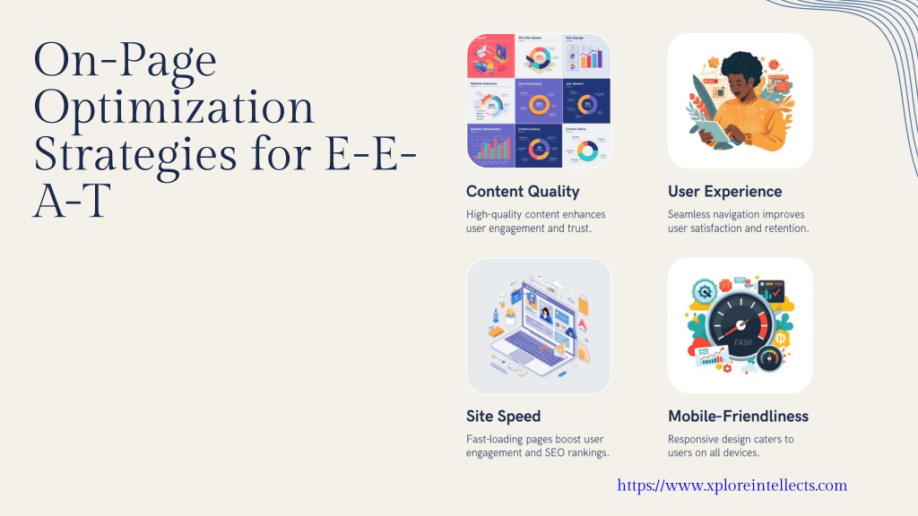 Content Quality • User Experience • Site Speed • Mobile-Friendliness • High-quality content enhances user engagement and trust. • Seamless navigation improves user satisfaction and retention. • Fast-loading pages boost user engagement and SEO rankings. • Responsive design caters to users on all devices. • On-Page Optimization Strategies for E-E-A-T https://www.xploreintellects.com