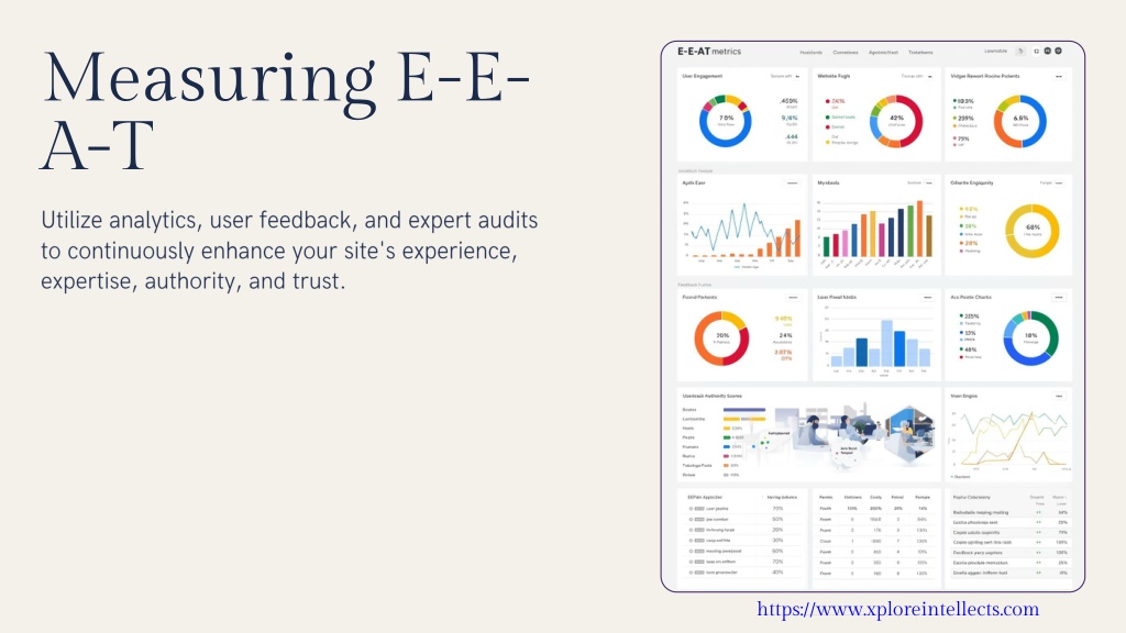 Measuring E-E-A-T • Utilize analytics, user feedback, and expert audits to continuously enhance your site's experience, expertise, authority, and trust. https://www.xploreintellects.com