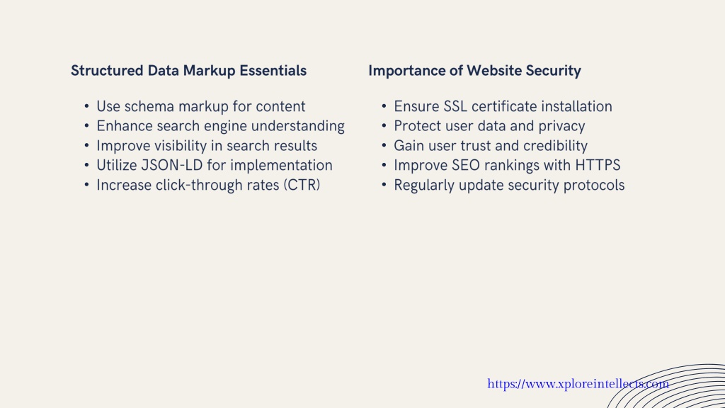 Structured Data Markup Essentials • Importance of Website Security • Use schema markup for content • Enhance search engine understanding • Improve visibility in search results • Utilize JSON-LD for implementation • Increase click-through rates (CTR) • Ensure SSL certificate installation • Protect user data and privacy • Gain user trust and credibility • Improve SEO rankings with HTTPS • Regularly update security protocols https://www.xploreintellects.com