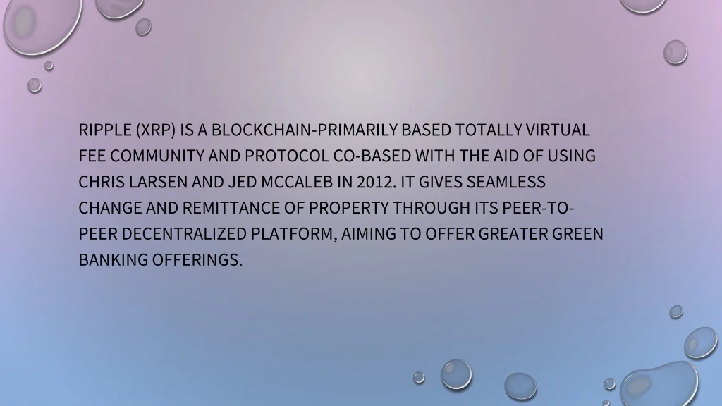 Ripple (XRP) is a blockchain-primarily based totally virtual fee community and protocol co-based with the aid of using Chris Larsen and Jed McCaleb in 2012. It gives seamless change and remittance of property through its peer-to-peer decentralized platform, aiming to offer greater green banking offerings.