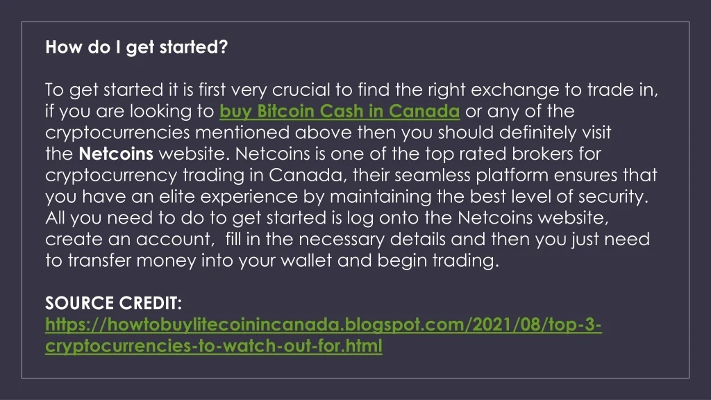 How do I get started?To get started it is first very crucial to find the right exchange to trade in, if you are looking to buy Bitcoin Cash in Canada or any of the cryptocurrencies mentioned above then you should definitely visit the Netcoins website. Netcoins is one of the top rated brokers for cryptocurrency trading in Canada, their seamless platform ensures that you have an elite experience by maintaining the best level of security. All you need to do to get started is log onto the Netcoins website, create an account, fill in the necessary details and then you just need to transfer money into your wallet and begin trading.SOURCE CREDIT: https://howtobuylitecoinincanada.blogspot.com/2021/08/top-3-cryptocurrencies-to-watch-out-for.html