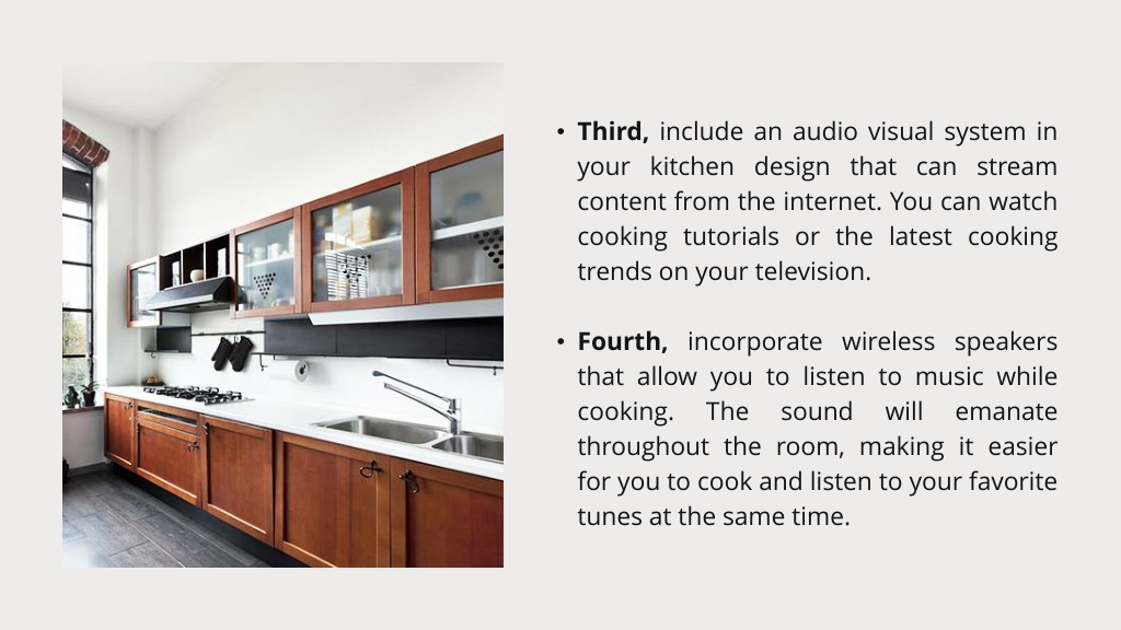 Third, include an audio visual system in your kitchen design that can stream content from the internet. You can watch cooking tutorials or the latest cooking trends on your television. • Fourth, incorporate wireless speakers that allow you to listen to music while cooking. The sound will emanate throughout the room, making it easier for you to cook and listen to your favorite tunes at the same time.