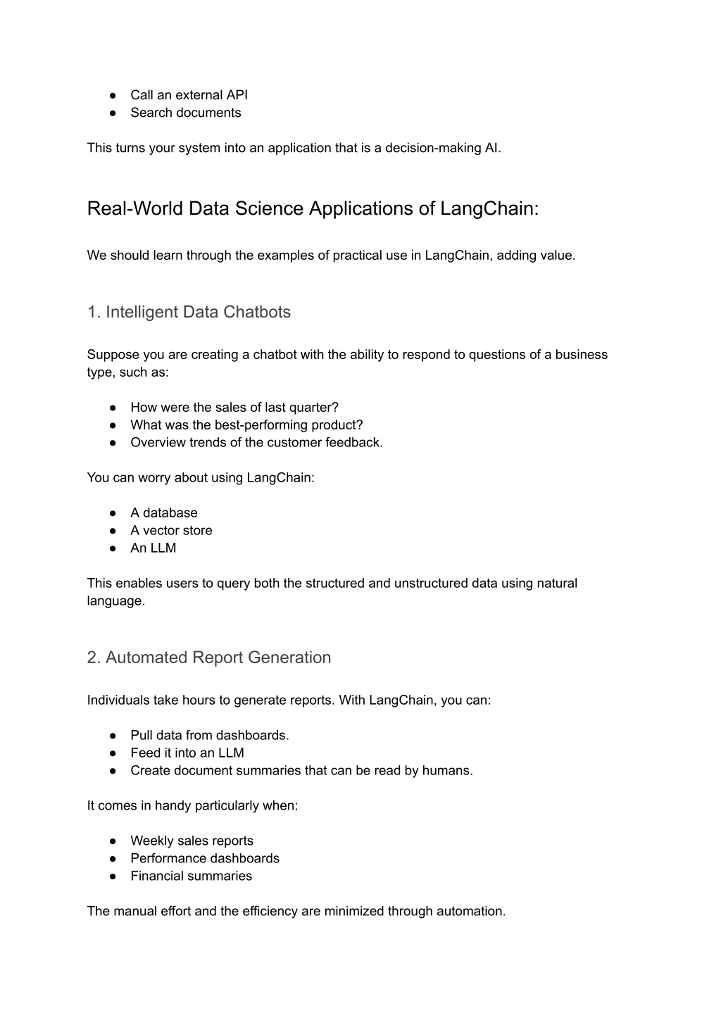 ● Call an external API ● Search documents This turns your system into an application that is a decision-making AI. Real-World Data Science Applications of LangChain: We should learn through the examples of practical use in LangChain, adding value. 1. Intelligent Data Chatbots Suppose you are creating a chatbot with the ability to respond to questions of a business type, such as: ● How were the sales of last quarter? ● What was the best-performing product? ● Overview trends of the customer feedback. You can worry about using LangChain: ● A database ● A vector store ● An LLM This enables users to query both the structured and unstructured data using natural language. 2. Automated Report Generation Individuals take hours to generate reports. With LangChain, you can: ● Pull data from dashboards. ● Feed it into an LLM ● Create document summaries that can be read by humans. It comes in handy particularly when: ● Weekly sales reports ● Performance dashboards ● Financial summaries The manual effort and the efficiency are minimized through automation.
