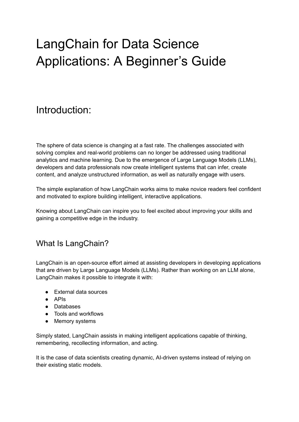 LangChain for Data Science Applications: A Beginner’s Guide Introduction: The sphere of data science is changing at a fast rate. The challenges associated with solving complex and real-world problems can no longer be addressed using traditional analytics and machine learning. Due to the emergence of Large Language Models (LLMs), developers and data professionals now create intelligent systems that can infer, create content, and analyze unstructured information, as well as naturally engage with users. The simple explanation of how LangChain works aims to make novice readers feel confident and motivated to explore building intelligent, interactive applications. Knowing about LangChain can inspire you to feel excited about improving your skills and gaining a competitive edge in the industry. What Is LangChain? LangChain is an open-source effort aimed at assisting developers in developing applications that are driven by Large Language Models (LLMs). Rather than working on an LLM alone, LangChain makes it possible to integrate it with: ● External data sources ● APIs ● Databases ● Tools and workflows ● Memory systems Simply stated, LangChain assists in making intelligent applications capable of thinking, remembering, recollecting information, and acting. It is the case of data scientists creating dynamic, AI-driven systems instead of relying on their existing static models.