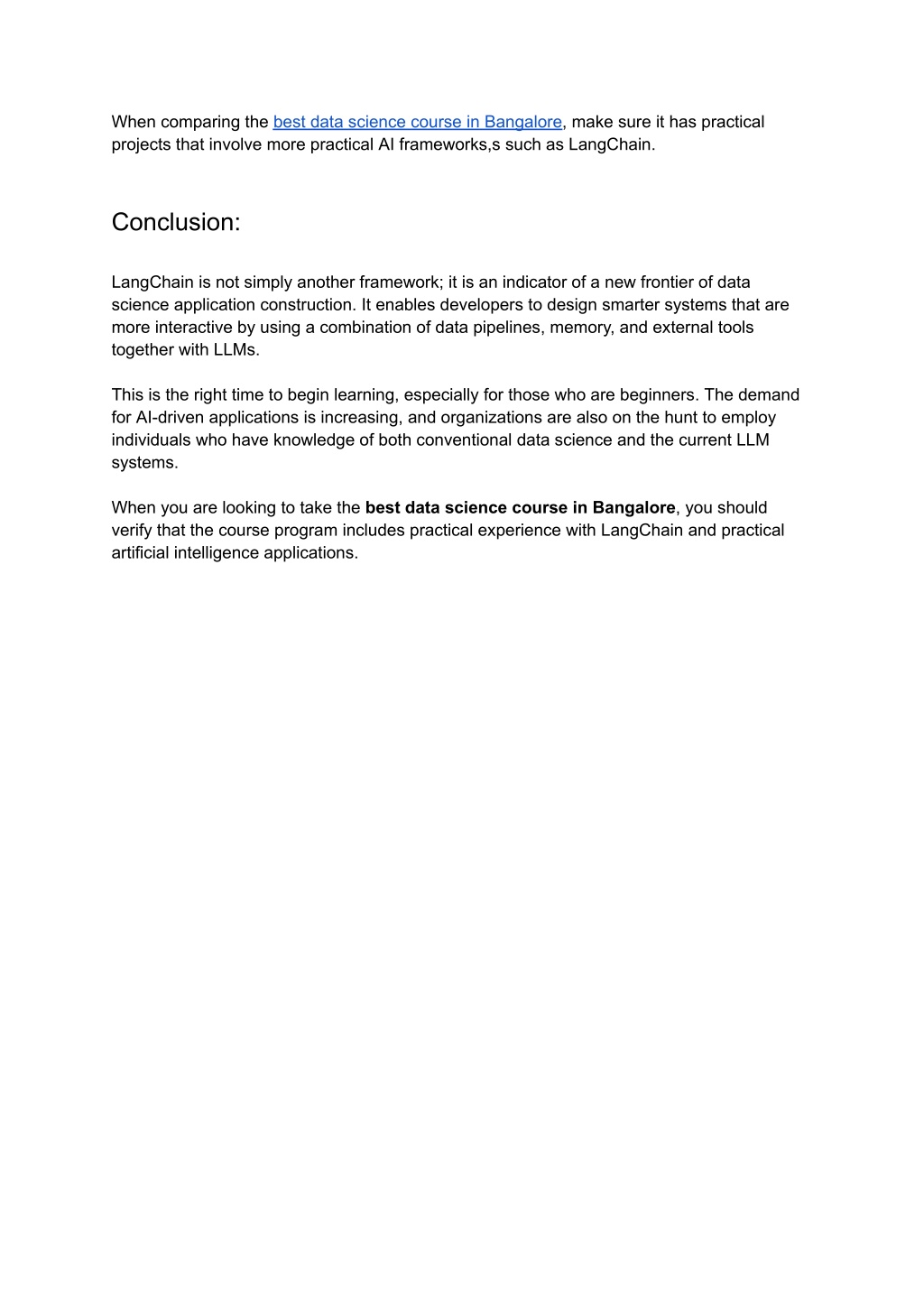 When comparing the best data science course in Bangalore, make sure it has practical projects that involve more practical AI frameworks,s such as LangChain. Conclusion: LangChain is not simply another framework; it is an indicator of a new frontier of data science application construction. It enables developers to design smarter systems that are more interactive by using a combination of data pipelines, memory, and external tools together with LLMs. This is the right time to begin learning, especially for those who are beginners. The demand for AI-driven applications is increasing, and organizations are also on the hunt to employ individuals who have knowledge of both conventional data science and the current LLM systems. When you are looking to take the best data science course in Bangalore, you should verify that the course program includes practical experience with LangChain and practical artificial intelligence applications.