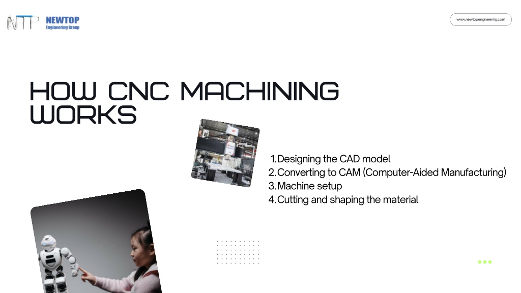 www.newtopengineering.com How CNC Machining Works 1. 2. 3. 4. Designing the CAD model Converting to CAM (Computer-Aided Manufacturing) Machine setup Cutting and shaping the material
