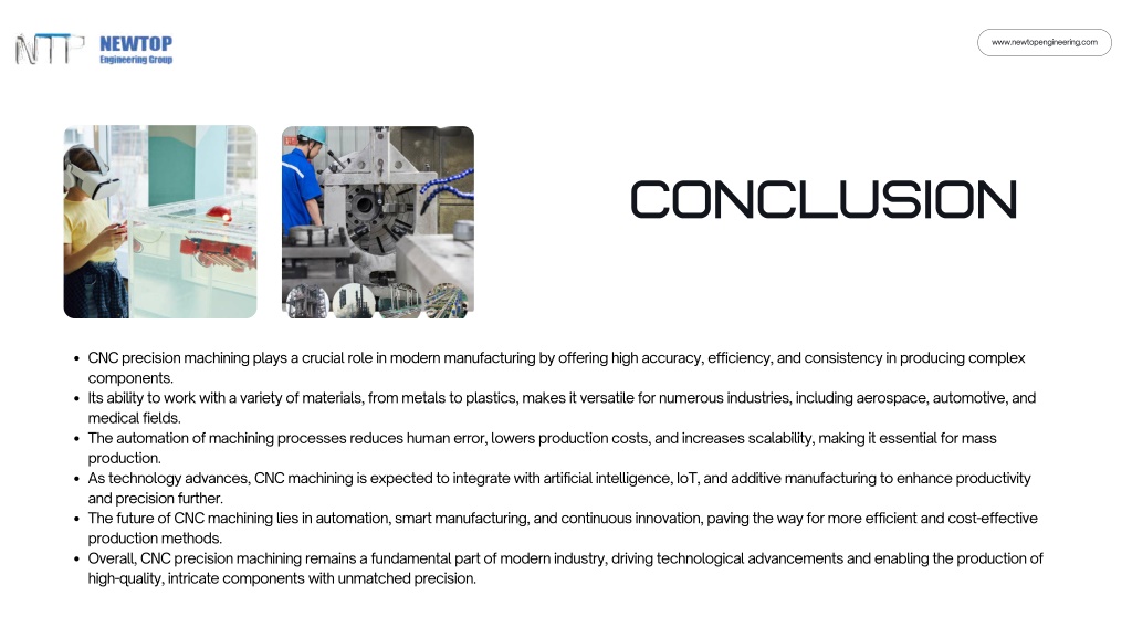 www.newtopengineering.com Conclusion CNC precision machining plays a crucial role in modern manufacturing by offering high accuracy, efficiency, and consistency in producing complex components. Its ability to work with a variety of materials, from metals to plastics, makes it versatile for numerous industries, including aerospace, automotive, and medical fields. The automation of machining processes reduces human error, lowers production costs, and increases scalability, making it essential for mass production. As technology advances, CNC machining is expected to integrate with artificial intelligence, IoT, and additive manufacturing to enhance productivity and precision further. The future of CNC machining lies in automation, smart manufacturing, and continuous innovation, paving the way for more efficient and cost-effective production methods. Overall, CNC precision machining remains a fundamental part of modern industry, driving technological advancements and enabling the production of high-quality, intricate components with unmatched precision.
