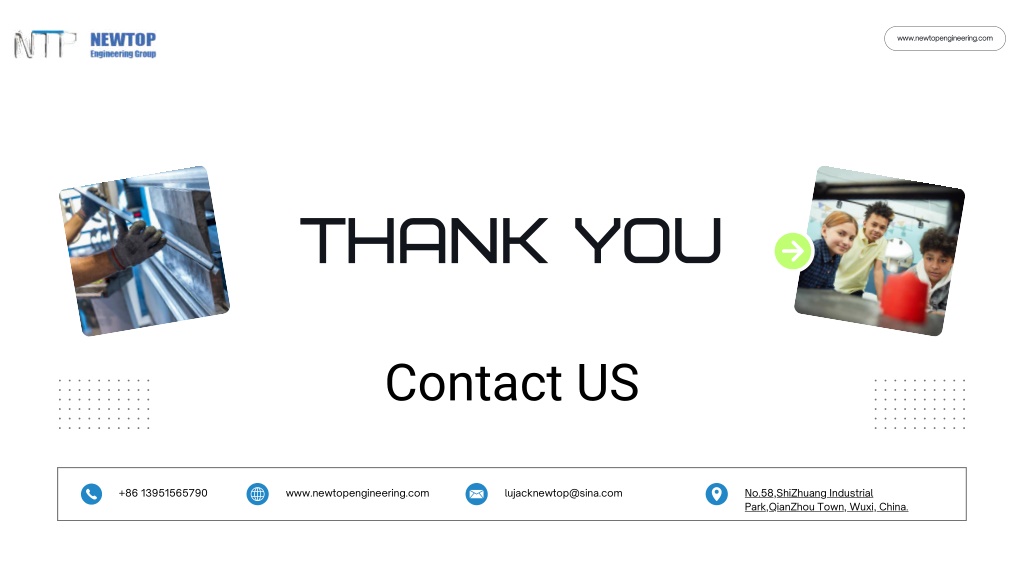 www.newtopengineering.com Thank You Contact US +86 13951565790 www.newtopengineering.com lujacknewtop@sina.com No.58,ShiZhuang Industrial Park,QianZhou Town, Wuxi, China.