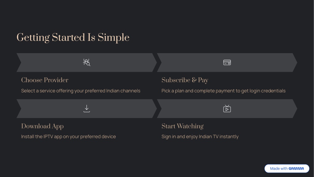 Getting Started Is Simple Choose Provider Subscribe & Pay Select a service offering your preferred Indian channels Pick a plan and complete payment to get login credentials Download App Start Watching Install the IPTV app on your preferred device Sign in and enjoy Indian TV instantly