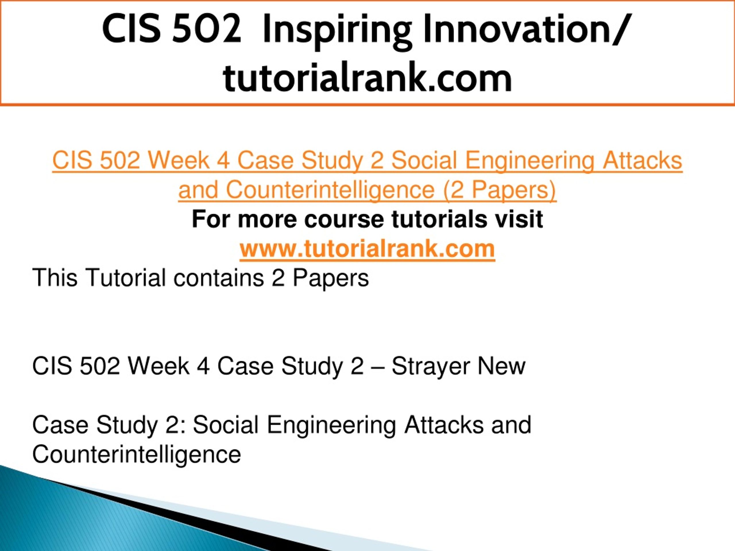 CIS 502 Inspiring Innovation/ tutorialrank.com CIS 502 Week 4 Case Study 2 Social Engineering Attacks and Counterintelligence (2 Papers) For more course tutorials visit www.tutorialrank.com This Tutorial contains 2 Papers CIS 502 Week 4 Case Study 2 – Strayer New Case Study 2: Social Engineering Attacks and Counterintelligence