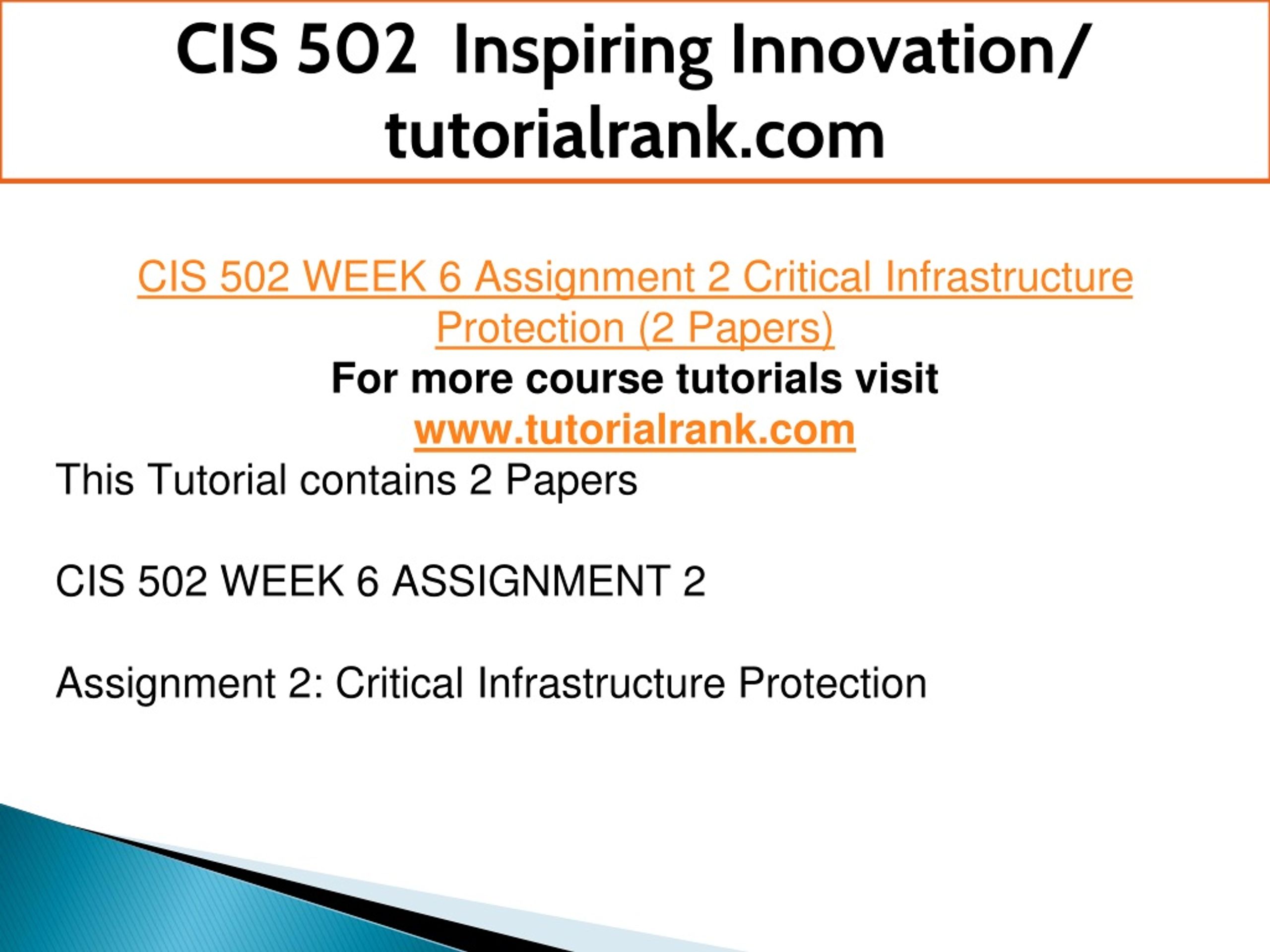 CIS 502 Inspiring Innovation/ tutorialrank.com CIS 502 WEEK 6 Assignment 2 Critical Infrastructure Protection (2 Papers) For more course tutorials visit www.tutorialrank.com This Tutorial contains 2 Papers CIS 502 WEEK 6 ASSIGNMENT 2 Assignment 2: Critical Infrastructure Protection