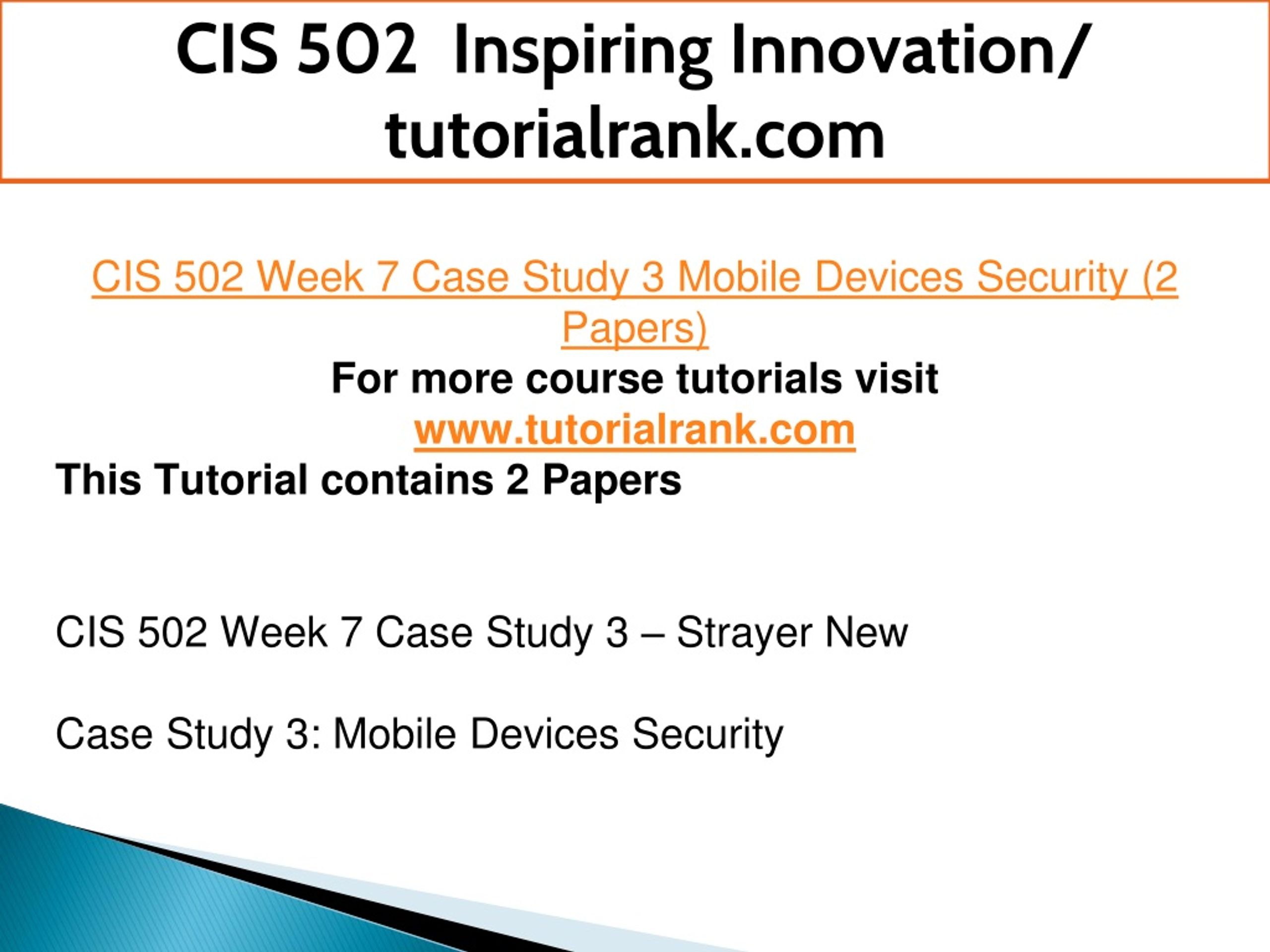 CIS 502 Inspiring Innovation/ tutorialrank.com CIS 502 Week 7 Case Study 3 Mobile Devices Security (2 Papers) For more course tutorials visit www.tutorialrank.com This Tutorial contains 2 Papers CIS 502 Week 7 Case Study 3 – Strayer New Case Study 3: Mobile Devices Security