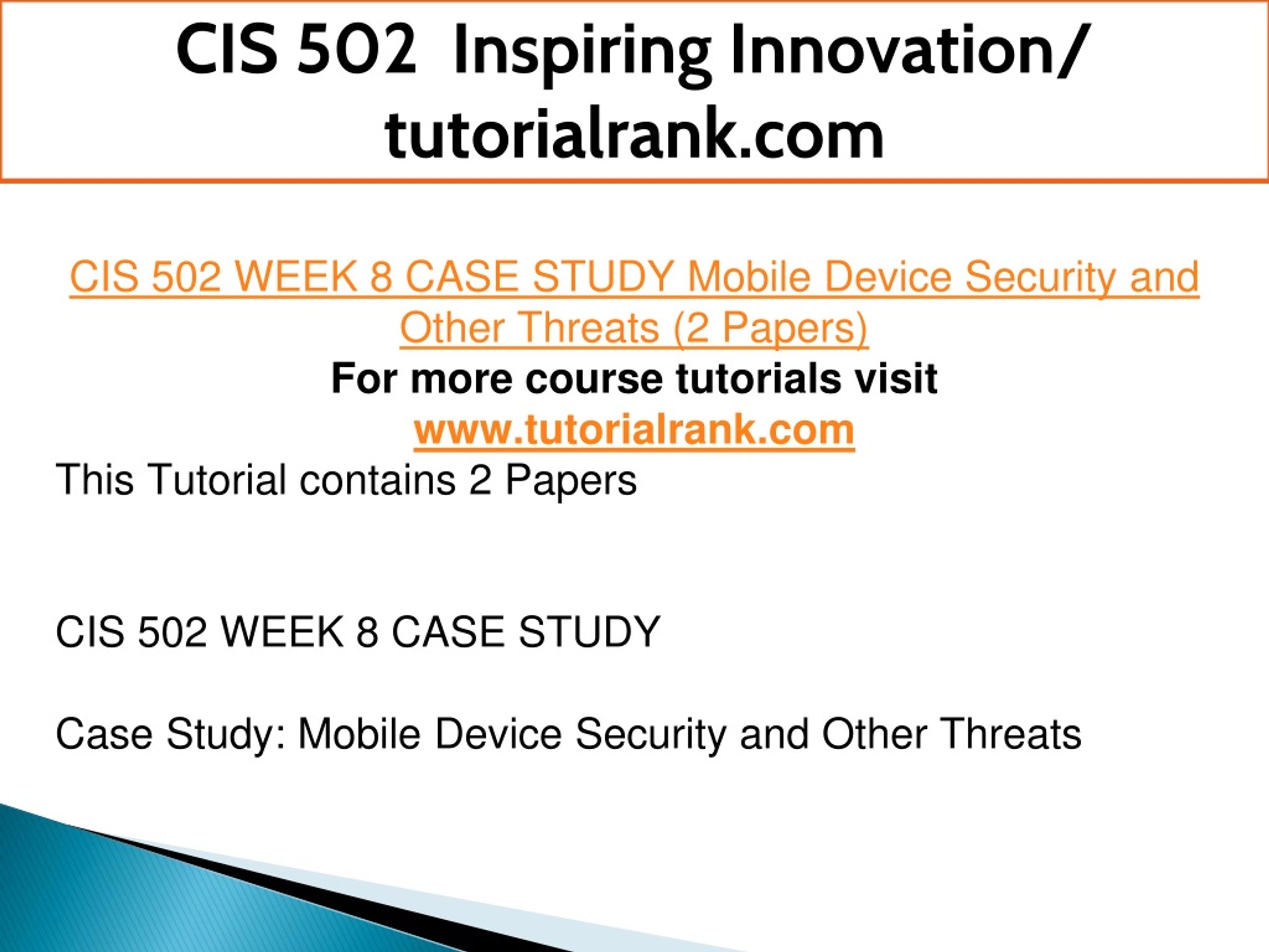 CIS 502 Inspiring Innovation/ tutorialrank.com CIS 502 WEEK 8 CASE STUDY Mobile Device Security and Other Threats (2 Papers) For more course tutorials visit www.tutorialrank.com This Tutorial contains 2 Papers CIS 502 WEEK 8 CASE STUDY Case Study: Mobile Device Security and Other Threats