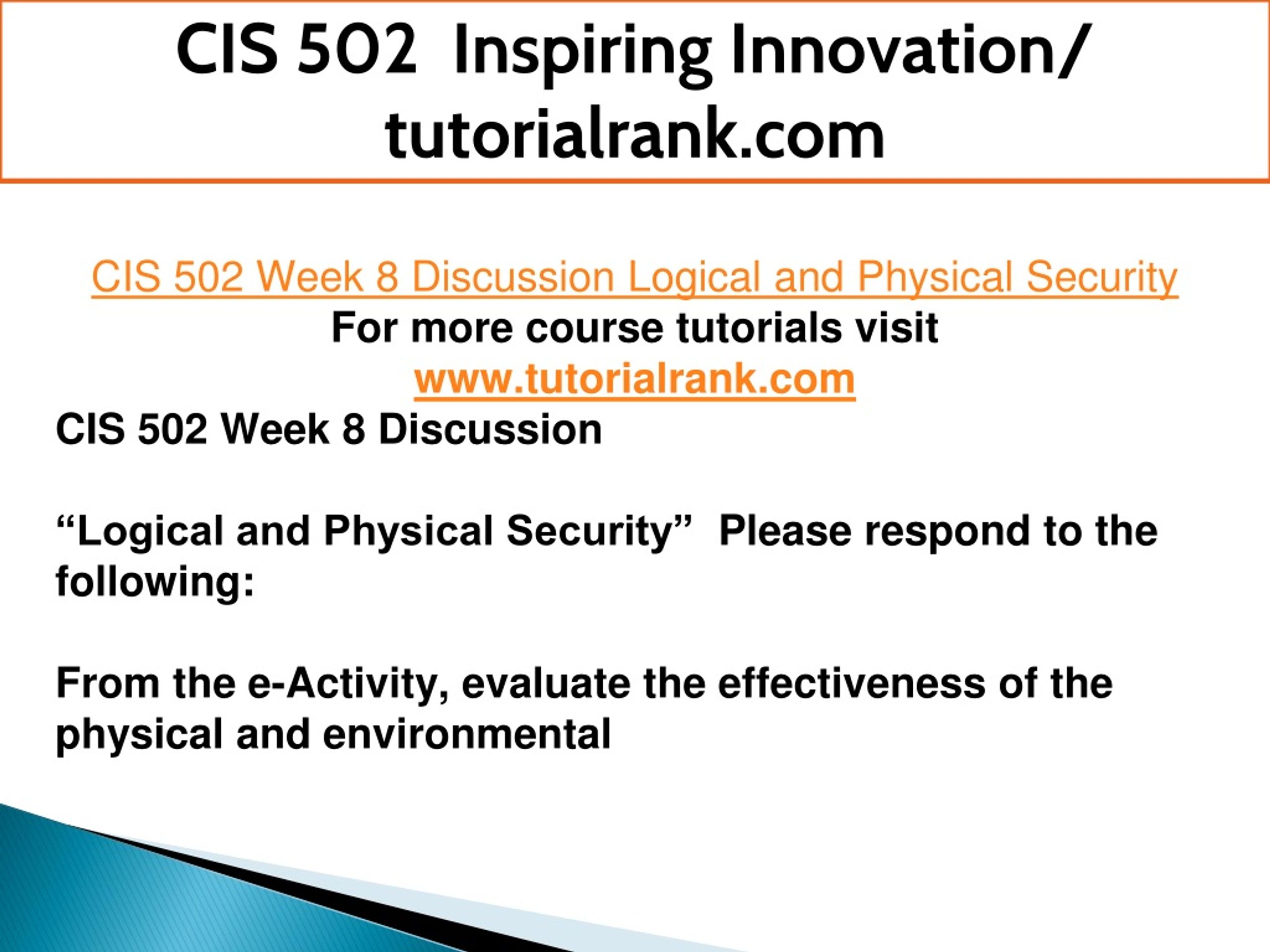 CIS 502 Inspiring Innovation/ tutorialrank.com CIS 502 Week 8 Discussion Logical and Physical Security For more course tutorials visit www.tutorialrank.com CIS 502 Week 8 Discussion “Logical and Physical Security” Please respond to the following: From the e-Activity, evaluate the effectiveness of the physical and environmental