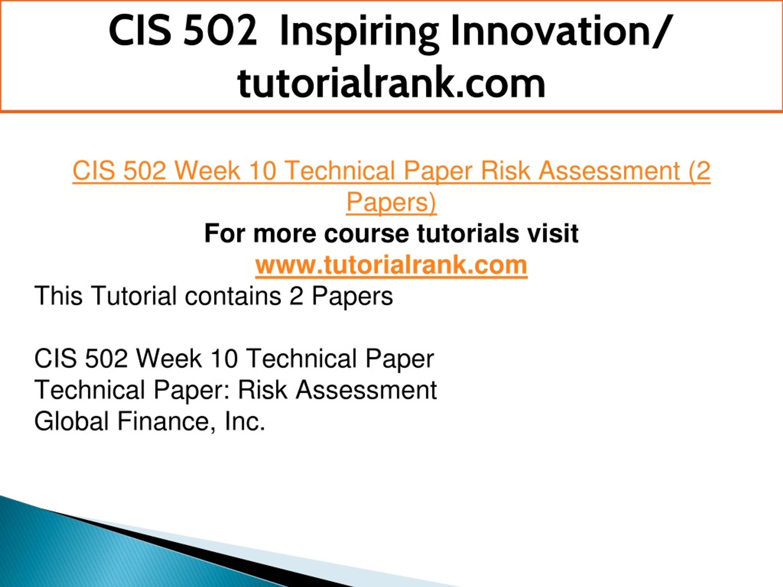 CIS 502 Inspiring Innovation/ tutorialrank.com CIS 502 Week 10 Technical Paper Risk Assessment (2 Papers) For more course tutorials visit www.tutorialrank.com This Tutorial contains 2 Papers CIS 502 Week 10 Technical Paper Technical Paper: Risk Assessment Global Finance, Inc.