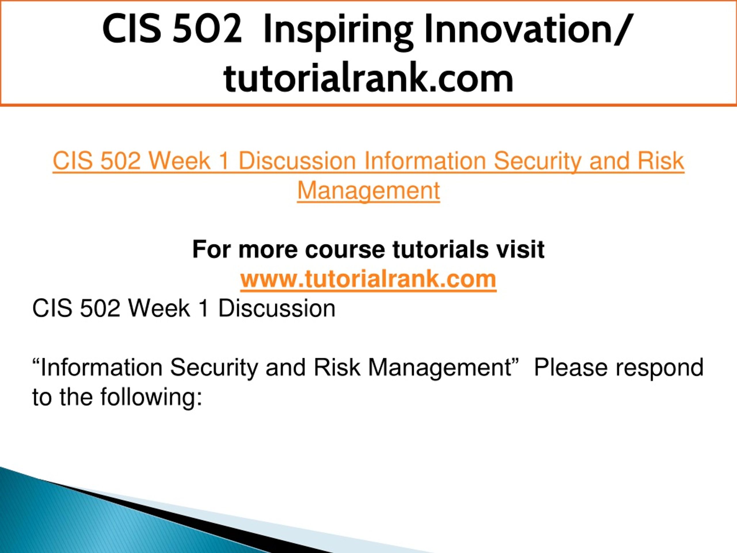 CIS 502 Inspiring Innovation/ tutorialrank.com CIS 502 Week 1 Discussion Information Security and Risk Management For more course tutorials visit www.tutorialrank.com CIS 502 Week 1 Discussion “Information Security and Risk Management” Please respond to the following: